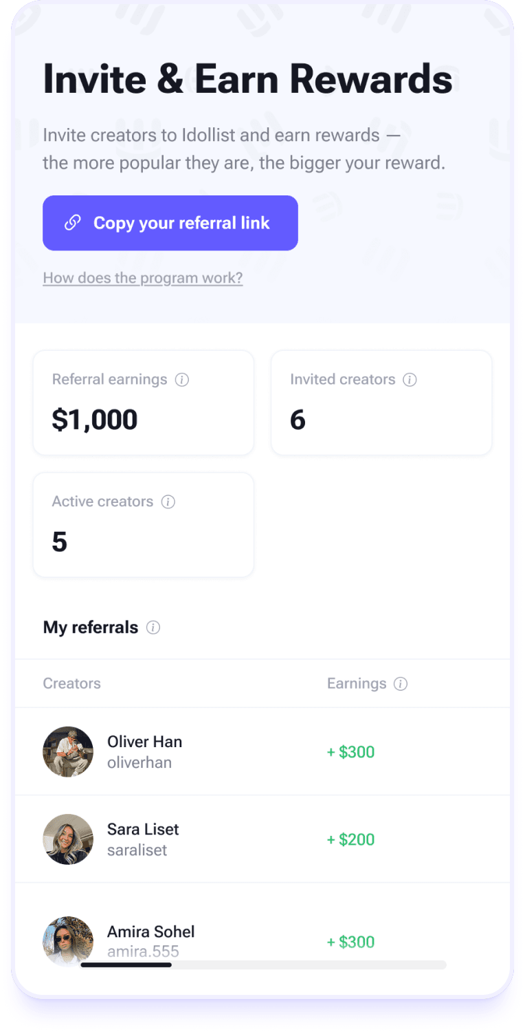 Invite new creators and earn up to $300 in bonus rewards for each active referral. The more successful creators you bring in, the more you earn.