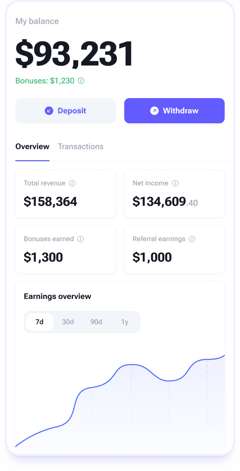 Track earnings, view transactions, and withdraw funds easily — with crypto support.